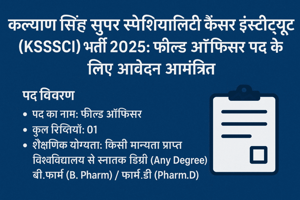 कल्याण सिंह सुपर स्पेशियलिटी कैंसर इंस्टीट्यूट (KSSSCI) ने वर्ष 2025 के लिए एक बड़ा अवसर जारी किया है। संस्थान ने फील्ड ऑफिसर पद पर भर्ती के लिए आधिकारिक अधिसूचना जारी कर दी है। इस भर्ती अभियान के तहत केवल 01 पद भरा जाएगा। यदि आप किसी भी स्नातक (Any Degree), बी.फार्म (B. Pharm) या फार्म.डी (Pharm.D) की डिग्री धारक हैं, तो यह आपके लिए एक सुनहरा अवसर साबित हो सकता है।